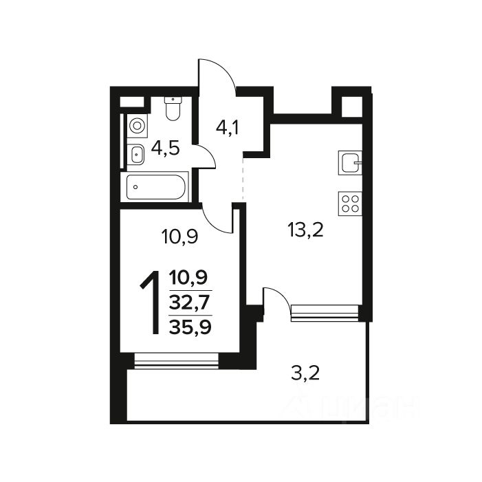 Общая площадь: 35.9 кв.м., жилая: 10.9 кв.м., площадь кухни: 13.2 кв.м. Этаж: 1.