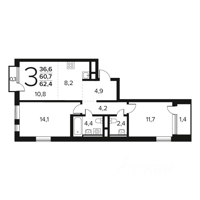 Общая площадь: 62.4 кв.м., жилая: 36.6 кв.м., площадь кухни: 8.2 кв.м. Этаж: 11.