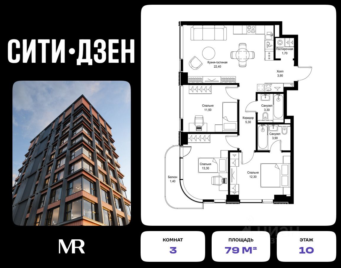 Продается 3-комнатная квартира от застройщика в жилом мультиквартале СИТИДЗЕН на 10-м этаже в корпусе #1. Общая площадь лота составляет 79 м²