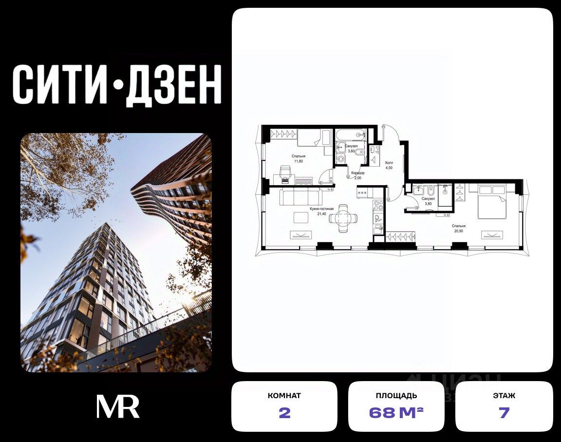 Продается 2-комнатная квартира от застройщика в жилом мультиквартале СИТИДЗЕН на 7-м этаже в корпусе #9 урбан-блока VOLNA. Общая площадь лота составляет 68 м²