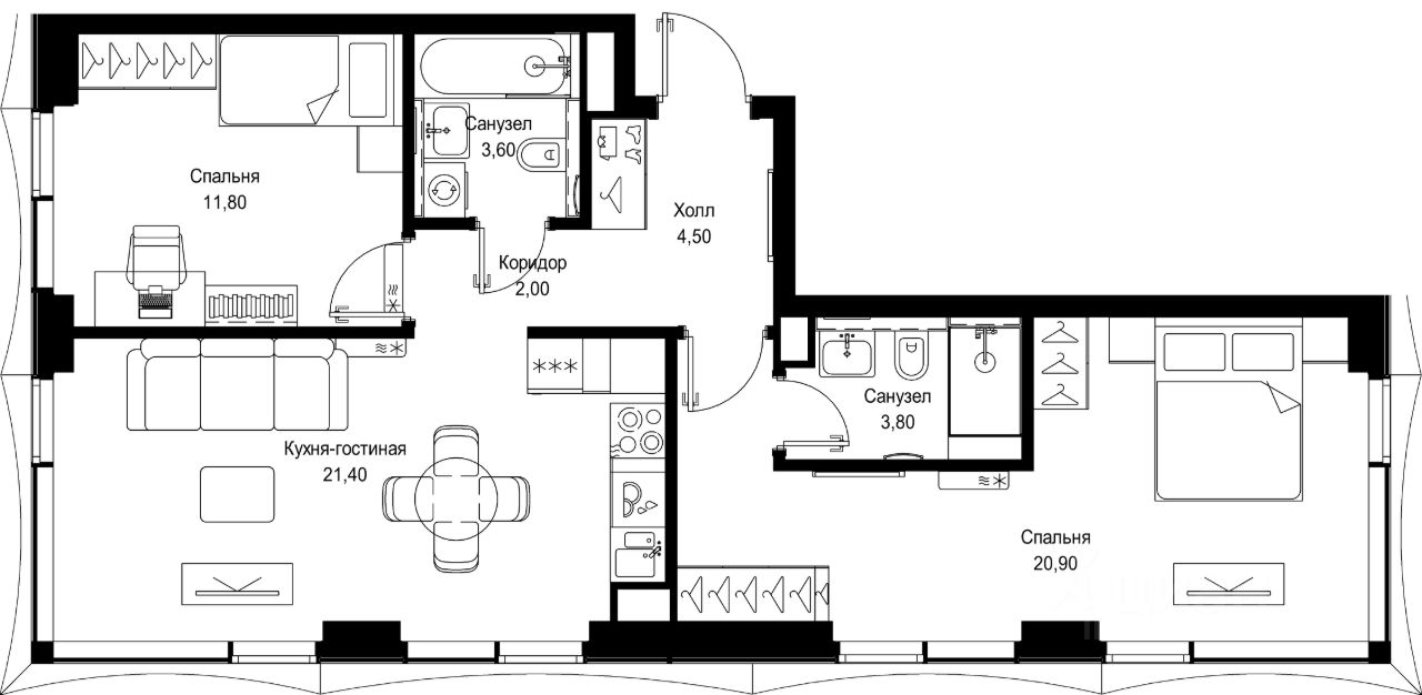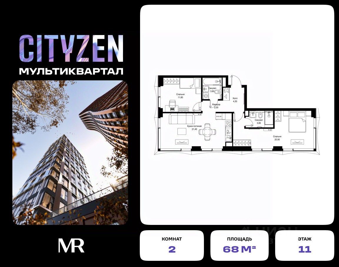 Продается 2-комнатная квартира от застройщика в жилом мультиквартале СИТИДЗЕН на 11-м этаже в корпусе #9 урбан-блока VOLNA. Общая площадь лота составляет 68 м²