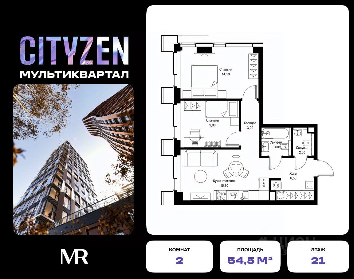 Продается 2-комнатная квартира от застройщика в жилом мультиквартале CITYZEN на 21-м этаже в корпусе #6 урбан-блока VOLNA. Общая площадь лота составляет 54.50 м²