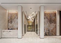Лобби проекта наполнено светом и спокойствием - здесь хочется ненадолго задержаться, перевести дыхание. Мягкое освещение создают авторские светильники: они подчеркивают архитектуру пространства и не утомляют глаз. Акцентный элемент - мозаичное панно с растительным мотивом, выполненное из керамических пластин, которое придает интерьеру изысканность и художественную выразительность."
