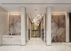 Лобби проекта наполнено светом и спокойствием - здесь хочется ненадолго задержаться, перевести дыхание. Мягкое освещение создают авторские светильники: они подчеркивают архитектуру пространства и не утомляют глаз. Акцентный элемент - мозаичное панно с растительным мотивом, выполненное из керамических пластин, которое придает интерьеру изысканность и художественную выразительность."