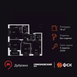 Продаётся 4-к квартира номер 32 общей площадью 76.5 кв.м. на 4-м этаже 27 этажного здания. Без отделки.