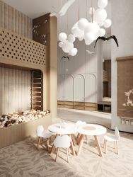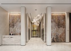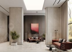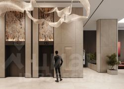 Лобби проекта наполнено светом и спокойствием - здесь хочется ненадолго задержаться, перевести дыхание. Мягкое освещение создают авторские светильники: они подчеркивают архитектуру пространства и не утомляют глаз. Акцентный элемент - мозаичное панно с растительным мотивом, выполненное из керамических пластин, которое придает интерьеру изысканность и художественную выразительность."