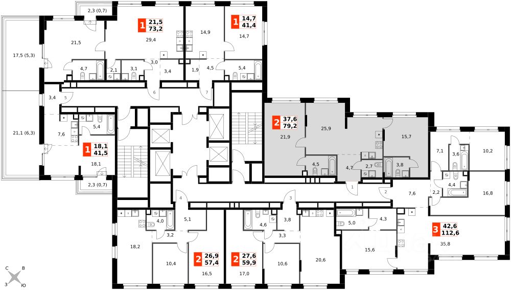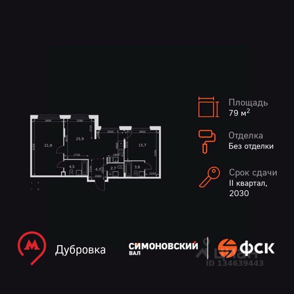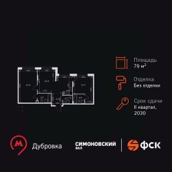 Продаётся 3-к квартира номер 234 общей площадью 79.2 кв.м. на 22-м этаже 27 этажного здания. Без отделки.