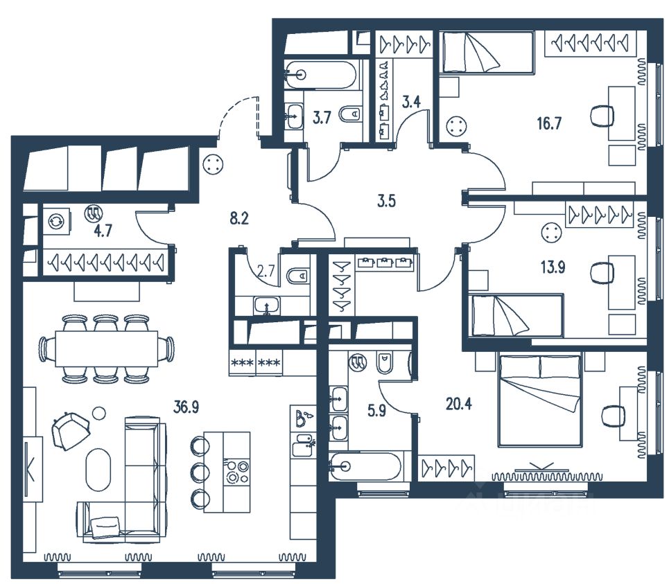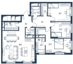 Просторная 4-комнатная квартира площадью 124,1 кв.м на высоком 20-м этаже в корп. 1 с функциональной планировкой: кухня 15,5 кв.м, гостиная 21,4 кв.м (с возможностью их объединения в кухню-гостиную), просторная мастер-спальня 20,4 кв.м с большой ванной 5,9 кв.м с окном и гардеробной, спальня 16,7 кв.м, детская 13 кв.м, ванная и санузел, две постирочные с гардеробной.