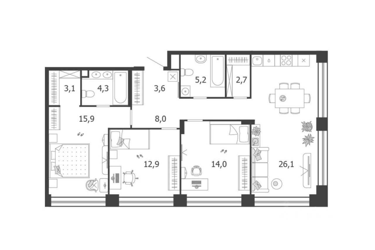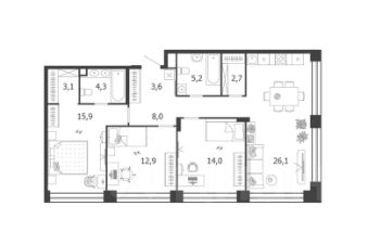 • кухню-гостиную 26,1 м² с угловым остеклением и возможность зонирования или разделения на отдельные пространства