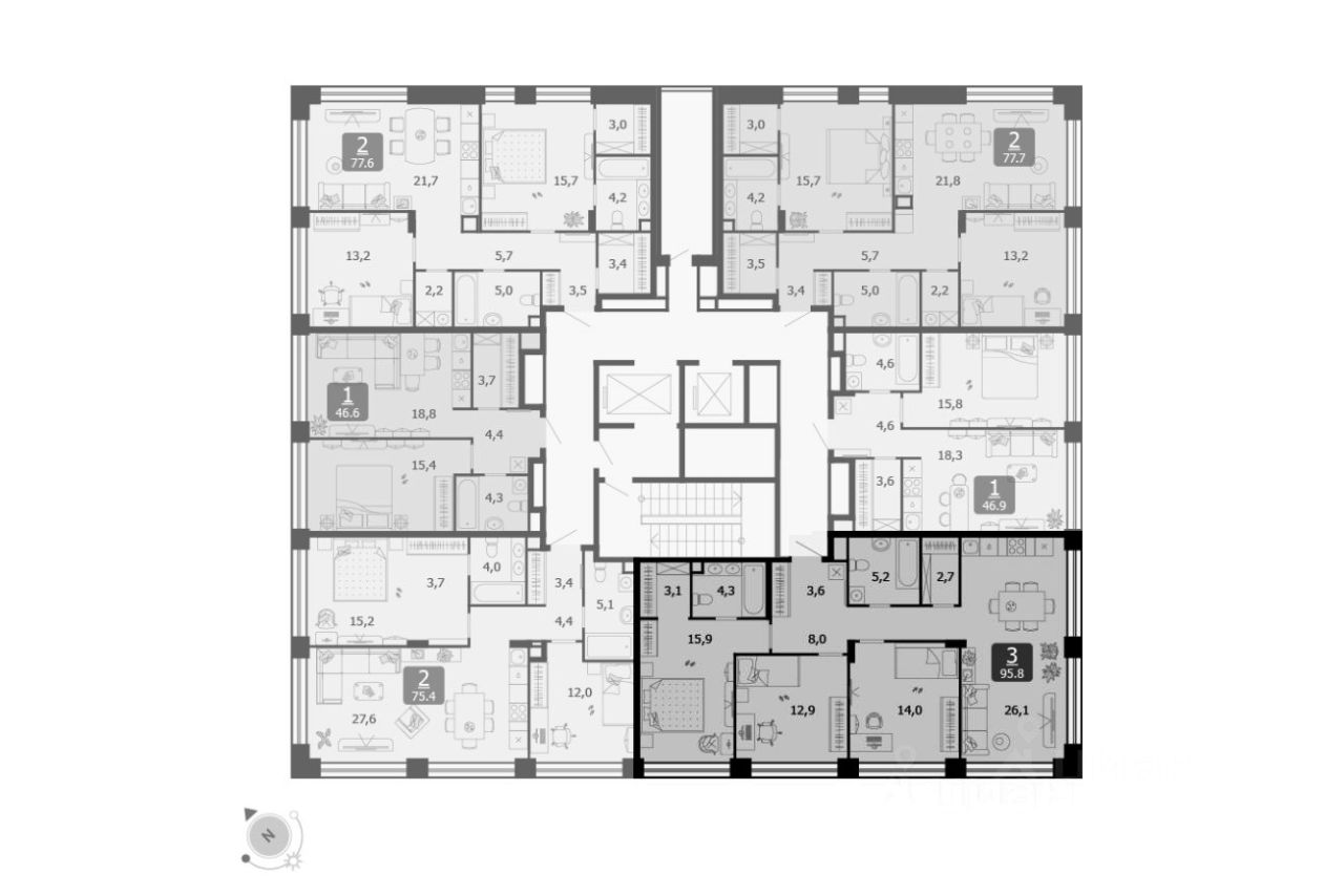 Угловая квартира с тремя спальнями и просторной кухней гостиной на 10 этаже 14-этажного дома.