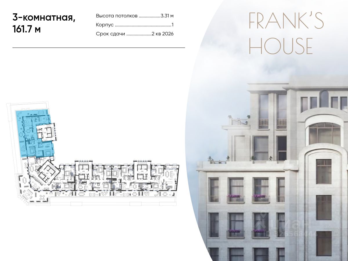 Продается трехкомнатная квартира в ЖК "Дом Франка" по адресу Москва, ЦАО, Мещанский, Большой Кисельный переулок, д. 11, корп. 1 Общая площадь квартиры - 161,70 кв.м., этаж 7. Стоимость квартиры - 493 185 000 р.