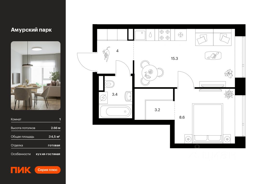 Продаётся 1-комн. квартира площадью 34,5 кв.м на 19 этаже 27 этажного дома (Корпус 4.5, Секция 6) проекта ПИК Амурский парк. Светлый просторный подъезд на уровне земли, функциональная планировка, большие окна, c отделкой.
