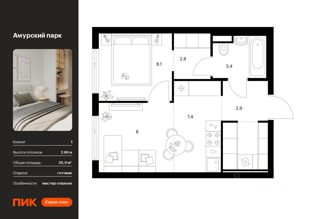 Продаётся 1-комн. квартира площадью 35,9 кв.м на 5 этаже 27 этажного дома (Корпус 4.5, Секция 6) проекта ПИК Амурский парк. Светлый просторный подъезд на уровне земли, функциональная планировка, большие окна, c отделкой.