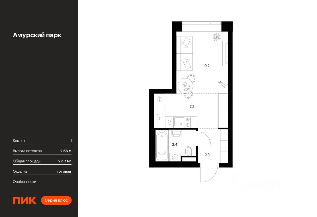 Продаётся квартира-студия площадью 22,7 кв.м на 27 этаже 27 этажного дома (Корпус 4.5, Секция 6) проекта ПИК Амурский парк. Светлый просторный подъезд на уровне земли, функциональная планировка, большие окна, c отделкой.