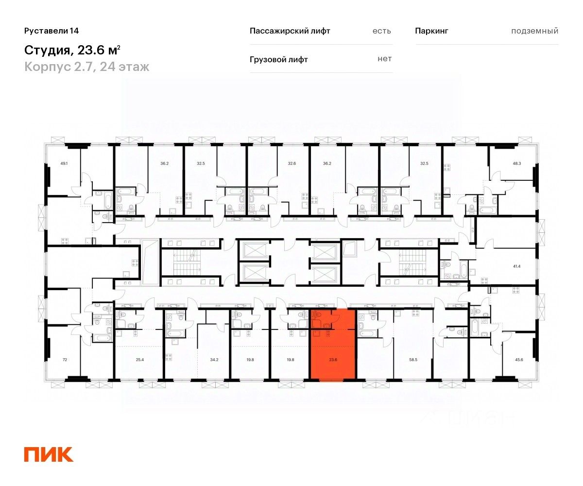 Продаётся квартира-студия площадью 23,7 кв.м на 24 этаже 33 этажного дома (Корпус 2.7, Секция 3) проекта ПИК Руставели 14. Светлый просторный подъезд на уровне земли, функциональная планировка, большие окна, c отделкой.