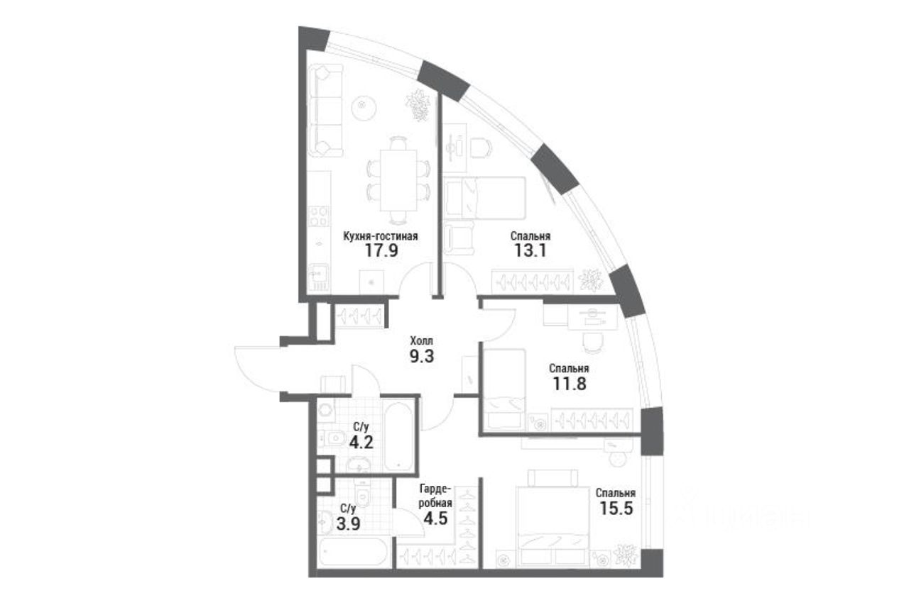 • вторую спальню с полукруговым остеклением и видом на две стороны (13,1 м²)