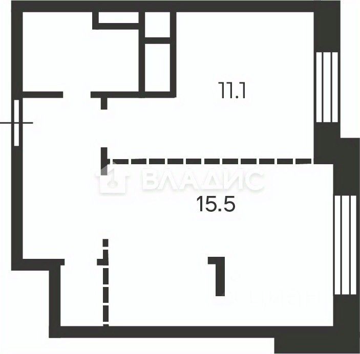 Общая площадь квартиры — 37,5 квадратных метров, жилая — 15,5 квадратных метров, площадь кухни — 11,1 квадратных метров. В квартире есть совмещённый санузел. Квартира без отделки, что даёт возможность новым владельцам воплотить свои дизайнерские идеи.