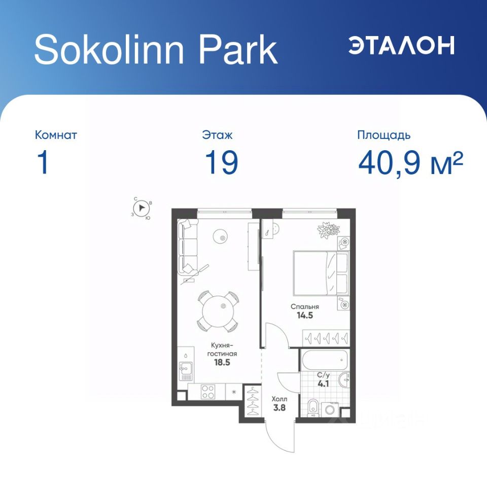 Общая площадь квартиры — 40.9 кв. м, этаж 19 из 21.