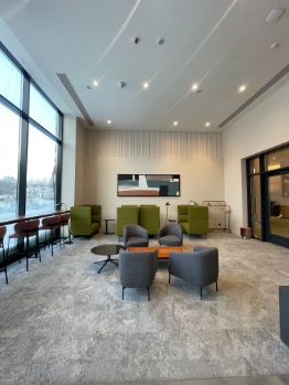 3 башни от 29 до 48 этажей объединены общим вестибюлем с мягкой мебелью, коворкингом, переговорной с кофе поинтом, колясочкой, детской игровой, гостевым санузлом и лаунж зонами.