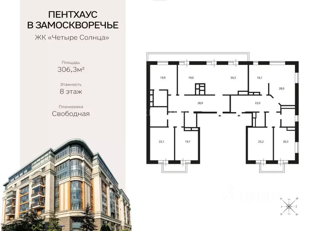 Окна на три стороны света, в том числе, в сторону Кремля.