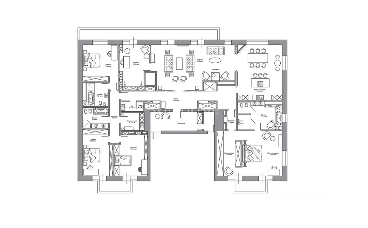 Возможности планировки: 4-5 спален, каждая 20+ кв. м, кабинет, просторная гостиная с каминной зоной, кухня-столовая, постирочная, 4 с/узла.