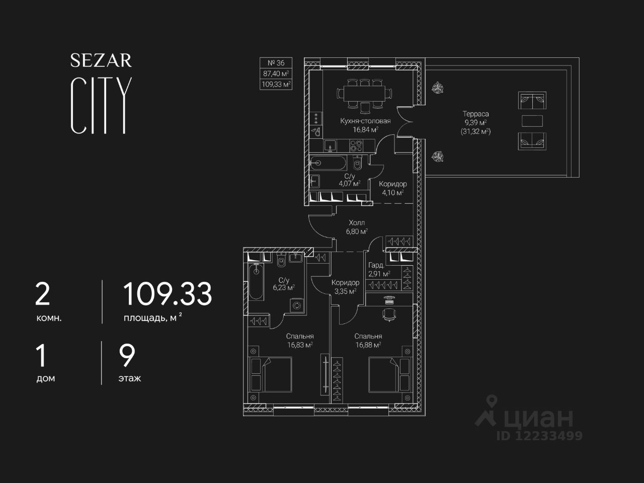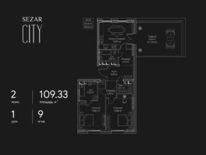 Продается 2-комнатная квартира в ЖК SEZAR CITY на 9 этаже. Общая площадь квартиры составляет 87,4 кв.м. Квартира без отделки. Срок сдачи - 2027 год.