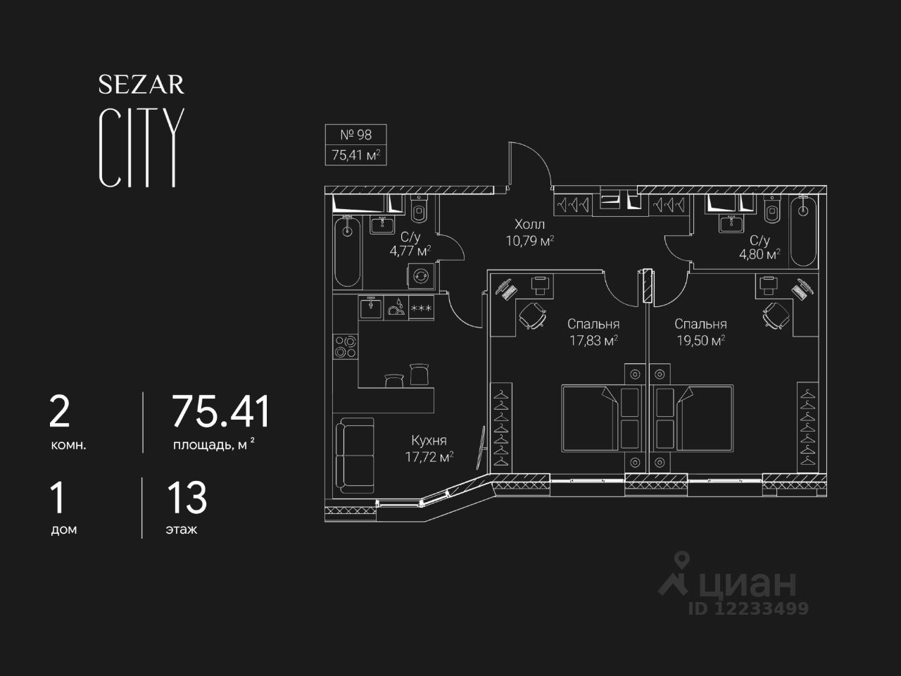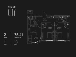 Продается 2-комнатная квартира в ЖК SEZAR CITY на 13 этаже. Общая площадь квартиры составляет 75,41 кв.м. Квартира без отделки. Срок сдачи - 2027 год.