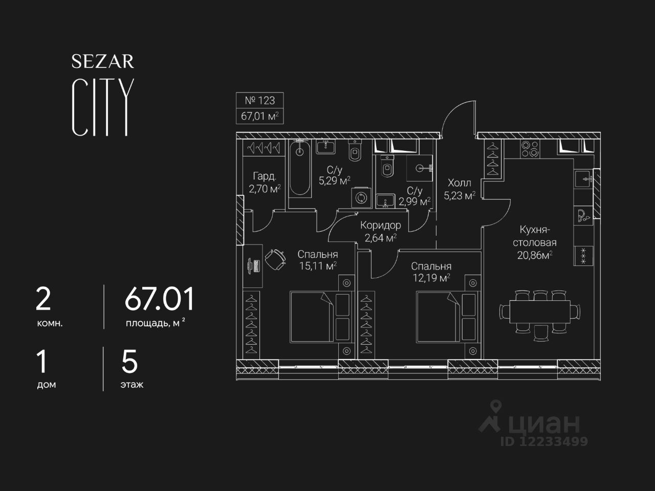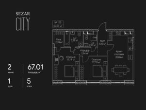 Продается 2-комнатная квартира в ЖК СЕЗАР СИТИ на 5 этаже. Общая площадь квартиры составляет 67,01 кв.м. Квартира без отделки. Срок сдачи - 2027 год.