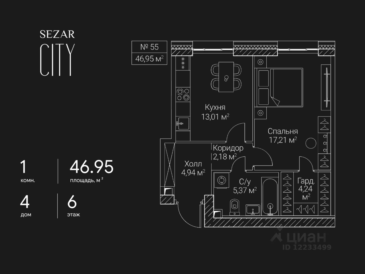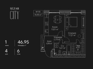 Продается 1-комнатная квартира в ЖК SEZAR CITY на 6 этаже. Общая площадь квартиры составляет 46,95 кв.м. Квартира без отделки. Срок сдачи - 2027 год.