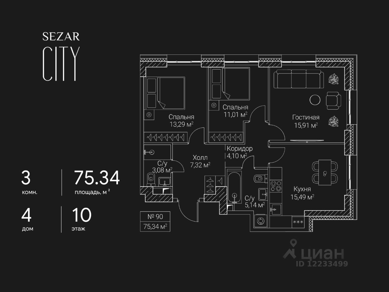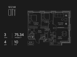 Продается 3-комнатная квартира в ЖК SEZAR CITY на 10 этаже. Общая площадь квартиры составляет 75,34 кв.м. Квартира без отделки. Срок сдачи - 2027 год.