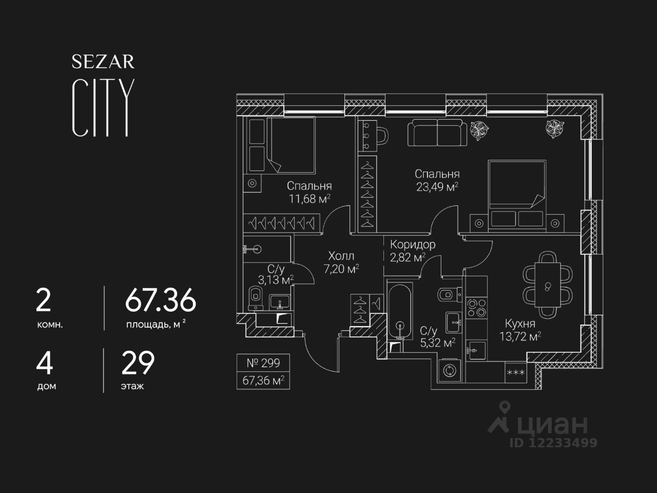 Продается 2-комнатная квартира в ЖК SEZAR CITY на 29 этаже. Общая площадь квартиры составляет 67,36 кв.м. Квартира без отделки. Срок сдачи - 2027 год.