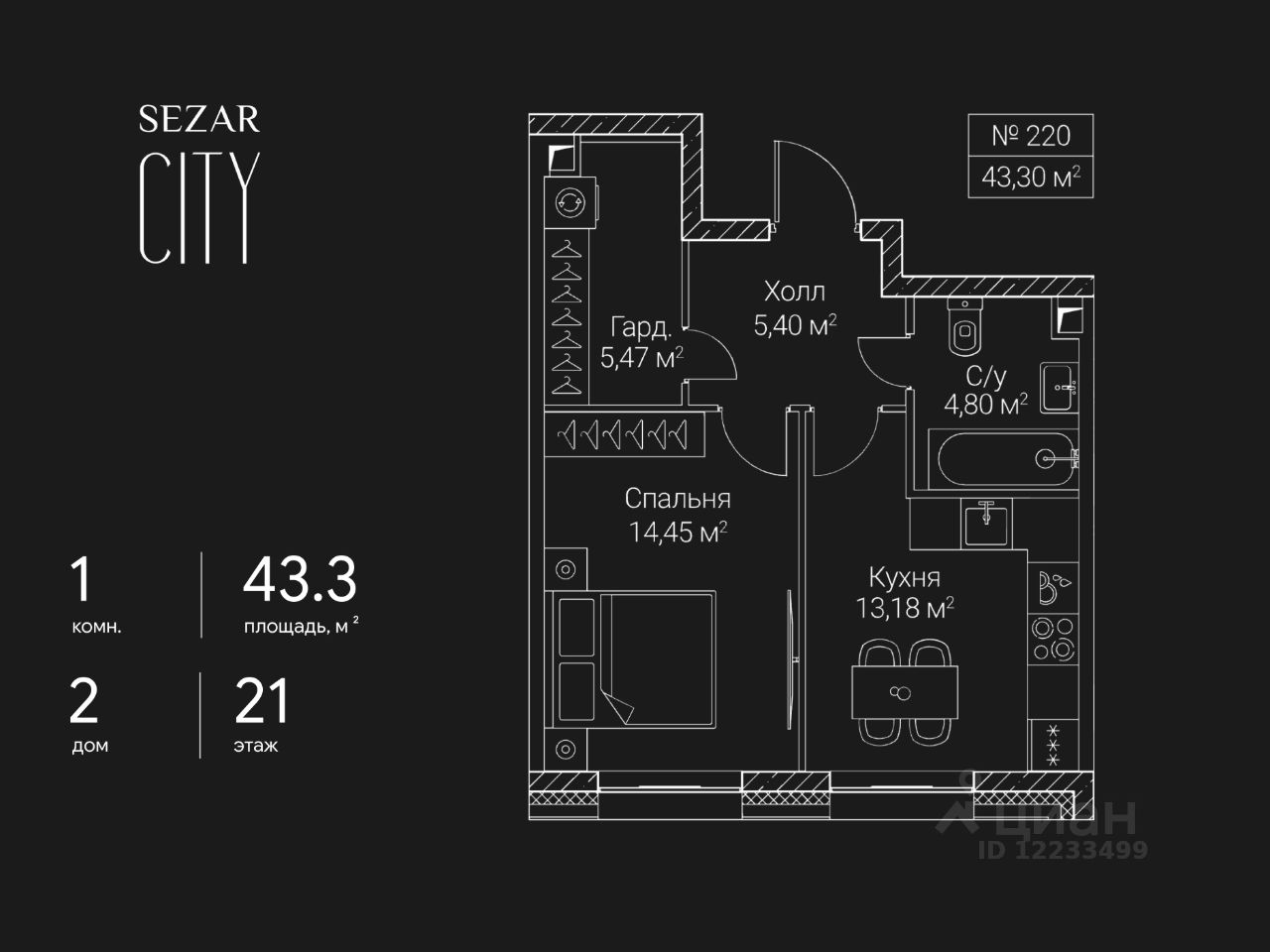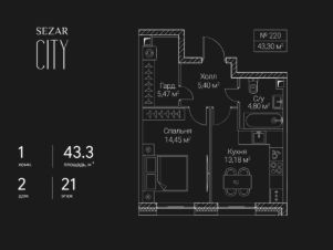 Продается 1-комнатная квартира в ЖК СЕЗАР СИТИ на 21 этаже. Общая площадь квартиры составляет 43,3 кв.м. Квартира без отделки. Срок сдачи - 2027 год.