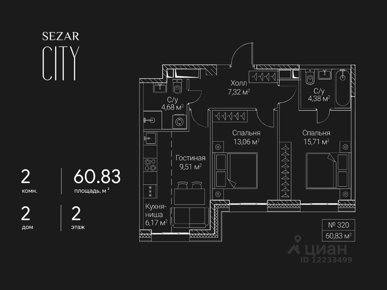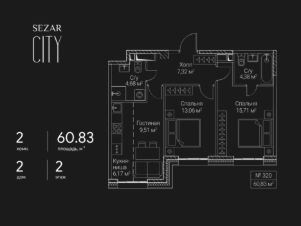 Продается 2-комнатная квартира в ЖК СЕЗАР СИТИ на 2 этаже. Общая площадь квартиры составляет 60,83 кв.м. Квартира без отделки. Срок сдачи - 2027 год.