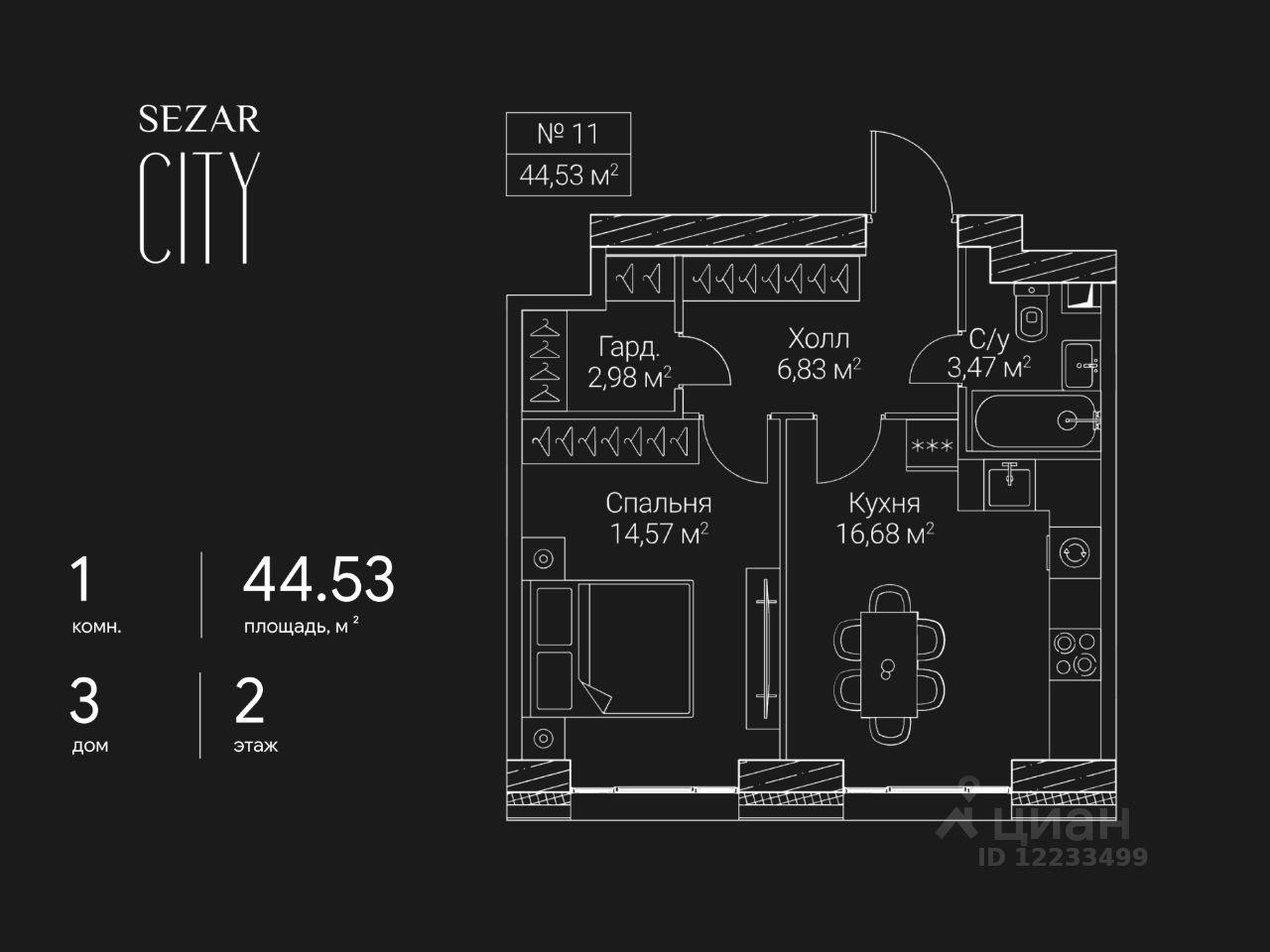 Продается 1-комнатная квартира в ЖК СЕЗАР СИТИ на 2 этаже. Общая площадь квартиры составляет 44,53 кв.м. Квартира без отделки. Срок сдачи - 2027 год.