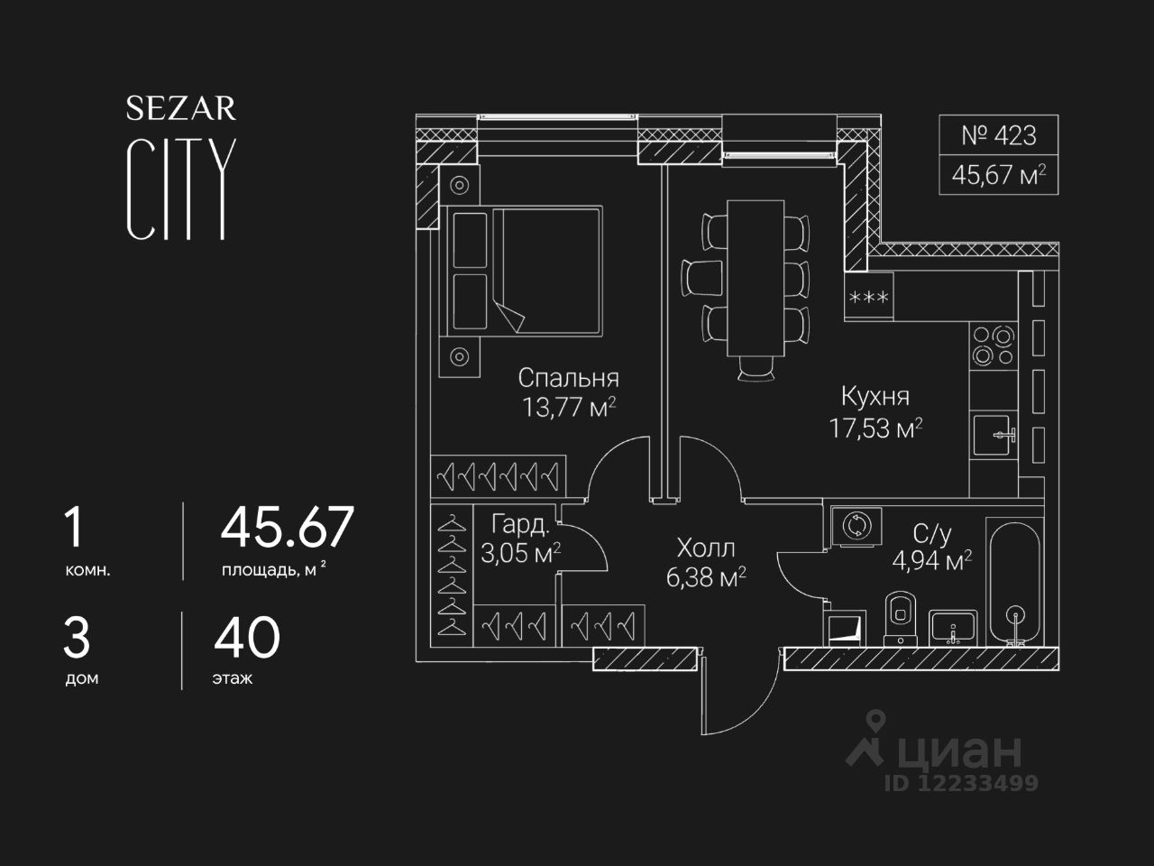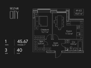 Продается 1-комнатная квартира в ЖК СЕЗАР СИТИ на 40 этаже. Общая площадь квартиры составляет 45,67 кв.м. Квартира без отделки. Срок сдачи - 2027 год.