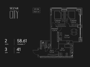 Продается 2-комнатная квартира в ЖК СЕЗАР СИТИ на 41 этаже. Общая площадь квартиры составляет 58,61 кв.м. Квартира без отделки. Срок сдачи - 2027 год.