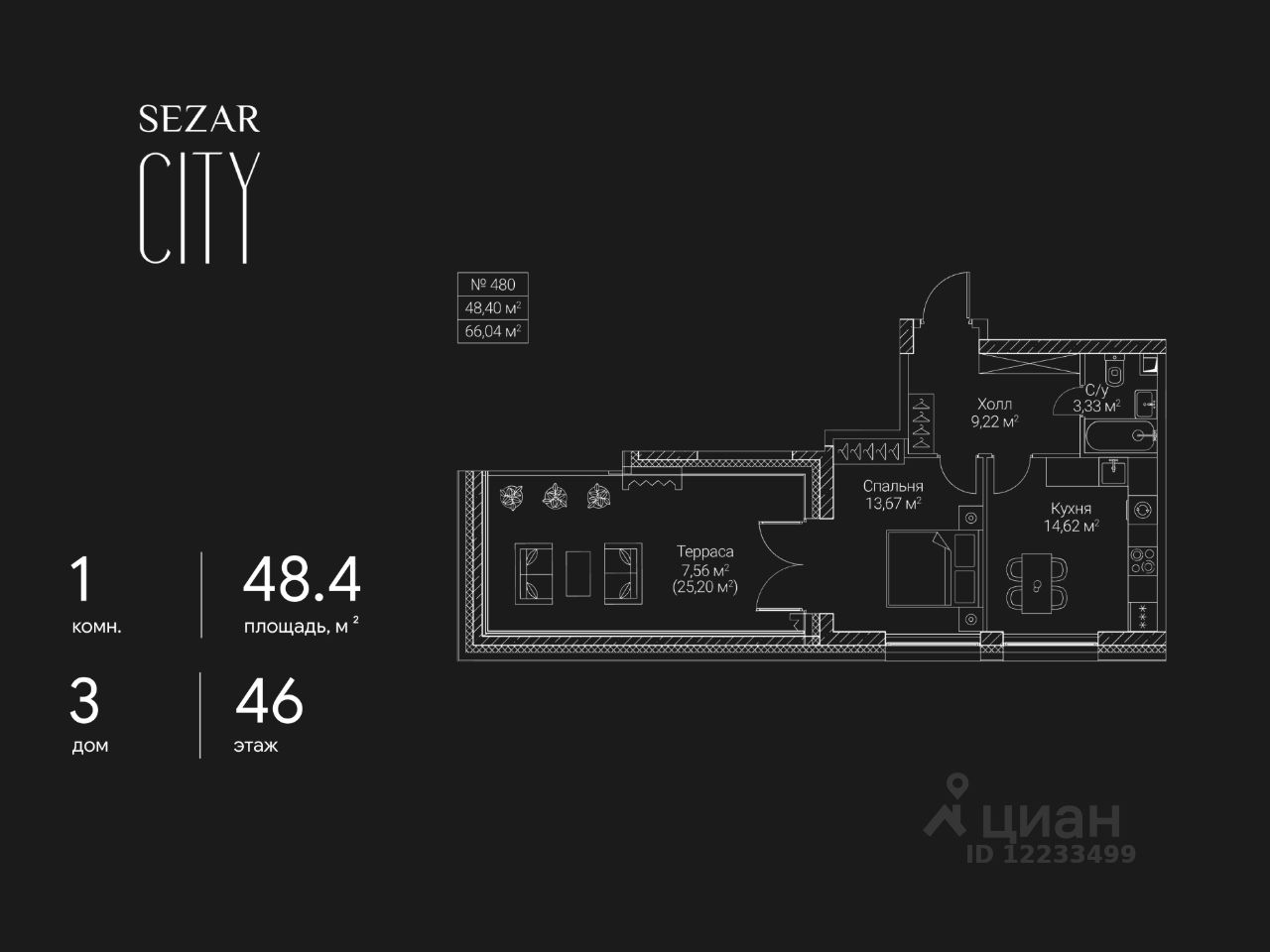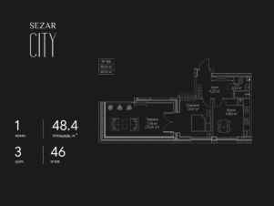 Продается 1-комнатная квартира в ЖК СЕЗАР СИТИ на 46 этаже. Общая площадь квартиры составляет 48,4 кв.м. Квартира без отделки. Срок сдачи - 2027 год.