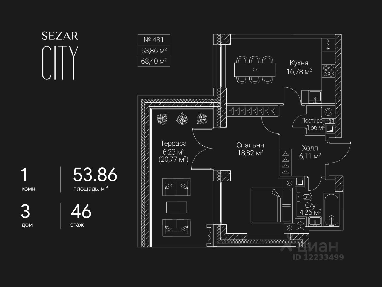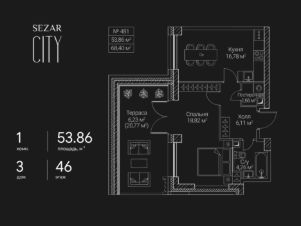 Продается 1-комнатная квартира в ЖК СЕЗАР СИТИ на 46 этаже. Общая площадь квартиры составляет 53,86 кв.м. Квартира без отделки. Срок сдачи - 2027 год.
