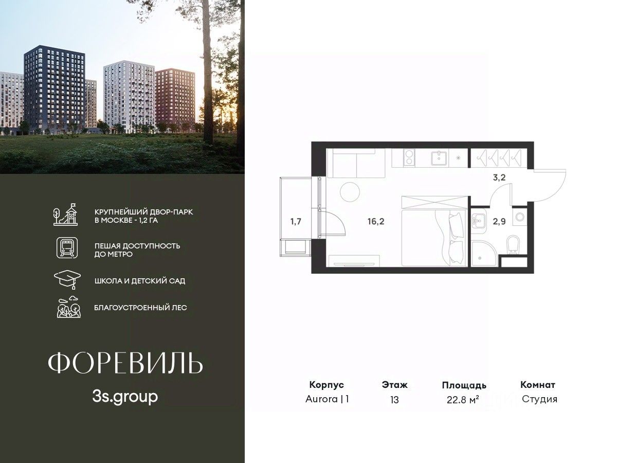 Продается уютная студия площадью 22,8 кв.м на 13 этаже 17 этажного жилого комплекса бизнес-класса Foreville от 3S Group.