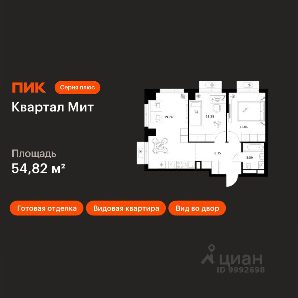 Продаётся 2-комн. квартира площадью 54,82 кв.м на 9 этаже 26 этажного дома (Корпус 3.2, Секция 2) проекта ПИК Квартал Мит. Светлый просторный подъезд на уровне земли, функциональная планировка, большие окна, c отделкой.
