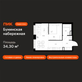 Продаётся 1-комн. квартира площадью 34,3 кв.м на 1 этаже 16 этажного дома (Корпус 2.6/1.4, Секция 4) проекта ПИК Бунинская набережная. Светлый просторный подъезд на уровне земли, функциональная планировка, большие окна, c отделкой.