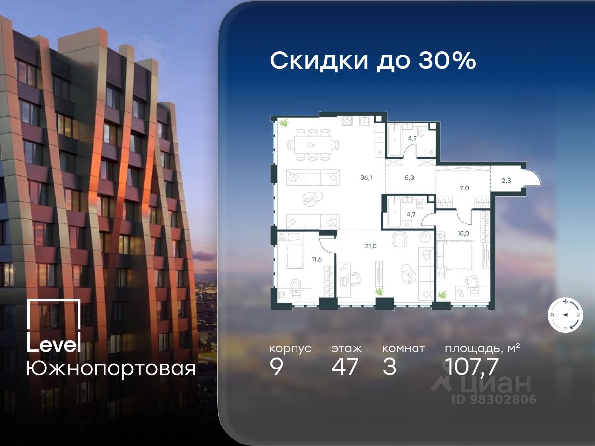 В северной части района Печатники продается 3-комнатная квартира площадью 107.70 кв.м без отделки. Квартира расположена на 47 этаже 49-этажного корпуса 9 в жилом комплексе комфорт-класса Левел Южнопортовая (компания Level Group/Левел групп).