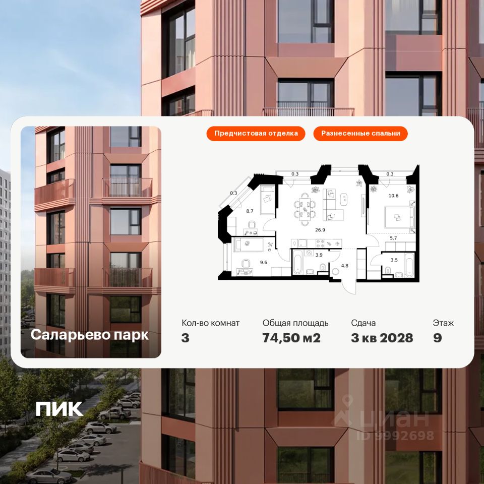 Продаётся 3-комн. квартира площадью 74,5 кв.м на 5 этаже 23 этажного дома (Корпус 69.1, Секция 1) проекта ПИК Саларьево парк. Светлый просторный подъезд на уровне земли, функциональная планировка, большие окна, предчистовая отделка.