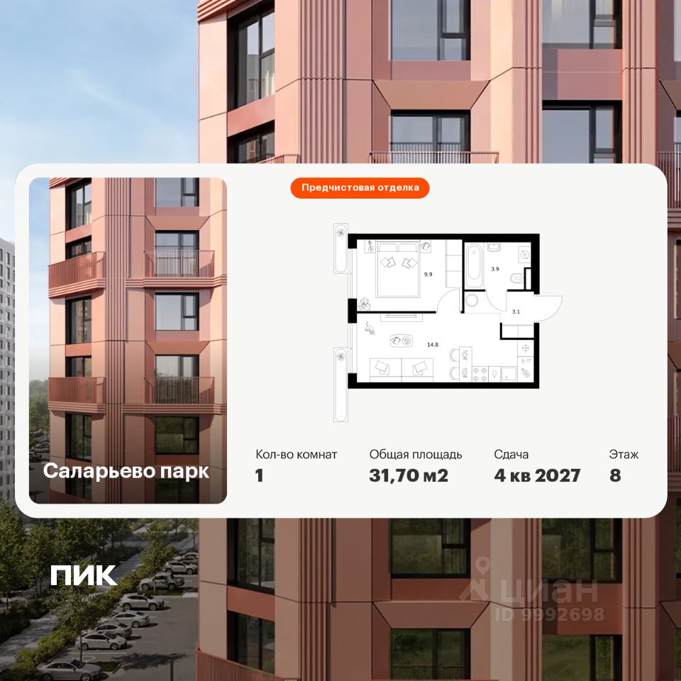 Продаётся 1-комн. квартира площадью 31,7 кв.м на 12 этаже 16 этажного дома (Корпус 57.4, Секция 4) проекта ПИК Саларьево парк. Светлый просторный подъезд на уровне земли, функциональная планировка, большие окна, предчистовая отделка. Жилой район "Саларьево парк" расположен в Новой Москве, в четырёх километрах от МКАД по Киевскому шоссе. Две станции метро: "Саларьево" и "Филатов луг", — находятся в пешей доступности от проекта. Дойти до них можно за 510 минут. В квартале уже создана качественная среда, где есть абсолютно всё для полноценной жизни, работы и отдыха. Благодаря удобному расположению проекта всё важное будет рядом: детские сады, школы, кафе и рестораны, шопинг в торговых центрах, фитнес и даже аэропорт. Все корпуса в квартале гармонично сочетаются, образуя единую городскую среду. Между собой их объединяет невысокая этажность и натуральная цветовая гамма. Здесь приятно гулять и проводить время на улице всей семьёй. В "Саларьево парке" создана уникальная образовательная среда, включающая в себя шесть школ, рассчитанных на 6 250 учеников. Две из них уже открыты, их посещает 2 300 детей. Также на территории "Саларьево парка" находится 12 детских садов, один из которых с бассейном. Сейчас уже открыты 7 садов. В "Саларьево парке" открыта уникальная игровая площадка — PlayHub "Оригами". Здесь есть ручей, горка-труба и рельефные холмы. Взрослые смогут отдохнуть в уютном кафе, пока дети играют. Также на территории проекта есть SportHub — большая спортивная зона, разделённая по интересам и возрастам. Здесь можно заниматься разными видами спорта: футболом, баскетболом, волейболом и стритболом. Зимой центральную часть площадки превращают в каток. Во дворах-парках жилого квартала есть места для отдыха, детские и спортивные площадки. На первых этажах домов расположены магазины, кафе и полезные сервисы. Также вблизи проекта есть несколько масштабных торговых центров. До ТЦ "Саларис" пять минут пешком, до "Рио", Metro Cash & Carry и "Леруа Мерлен" — пять минут на автомобиле. Артикул 1018644 (Застройщик ООО "Специализированный Застройщик "Тирон")