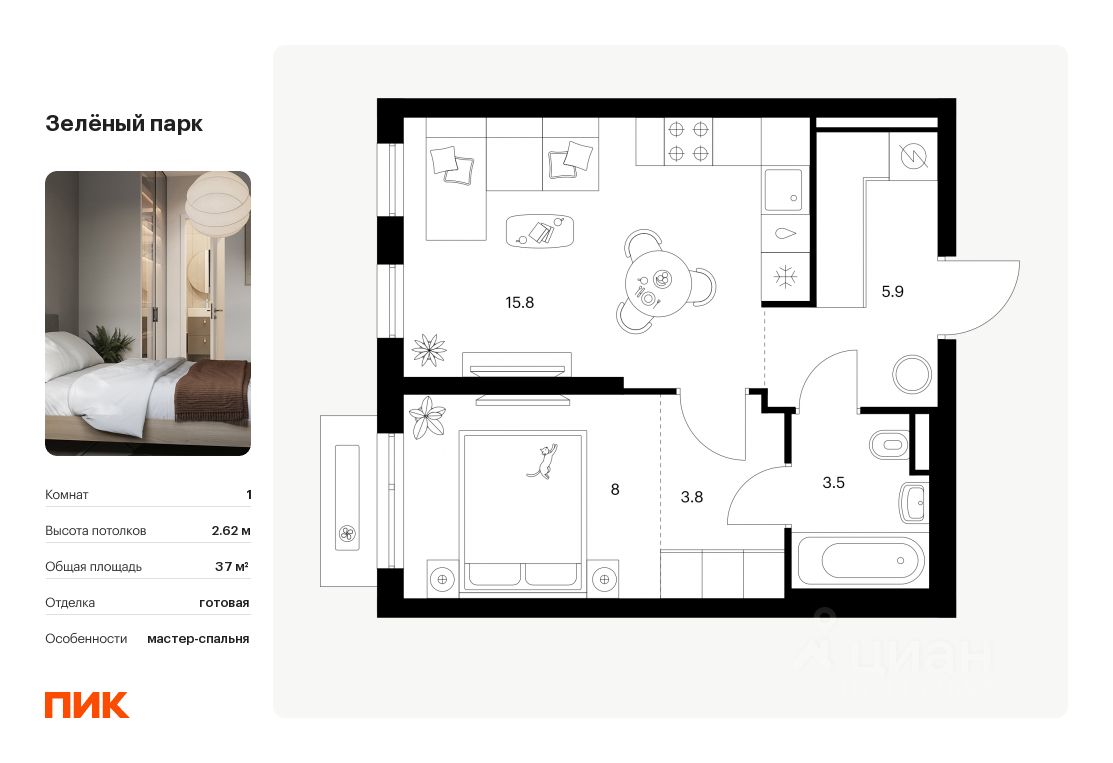 Продаётся 1-комн. квартира площадью 37 кв.м на 6 этаже 13 этажного дома (Корпус 5.3, Секция 3) проекта ПИК Зелёный парк. Светлый просторный подъезд на уровне земли, функциональная планировка, большие окна, c отделкой.