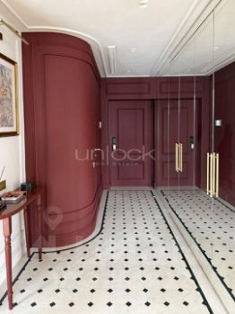 * Холл (французская плитка, правильный винный оттенок стен, крупный зеркальный шкаф, выполненный на заказ в бордовом цвете).