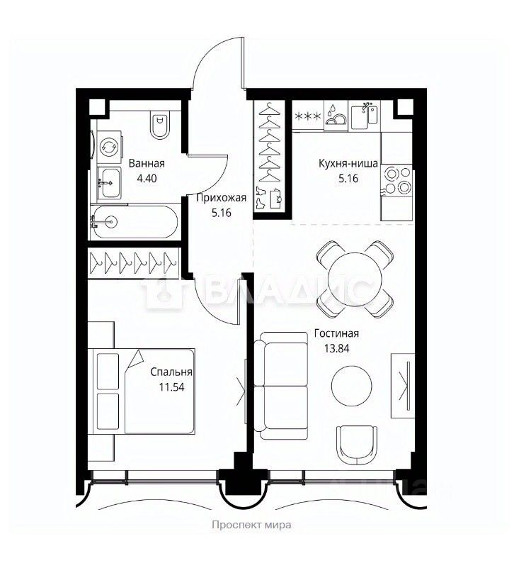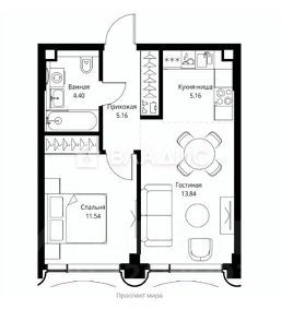Корпус 1. Квартира - 39.55 кв.м. Кухня - гостиная - 19 кв.м Спальня - 11.54 кв.м. Совмещенный санузел - 4.4 кв.м Высокие потолки!
