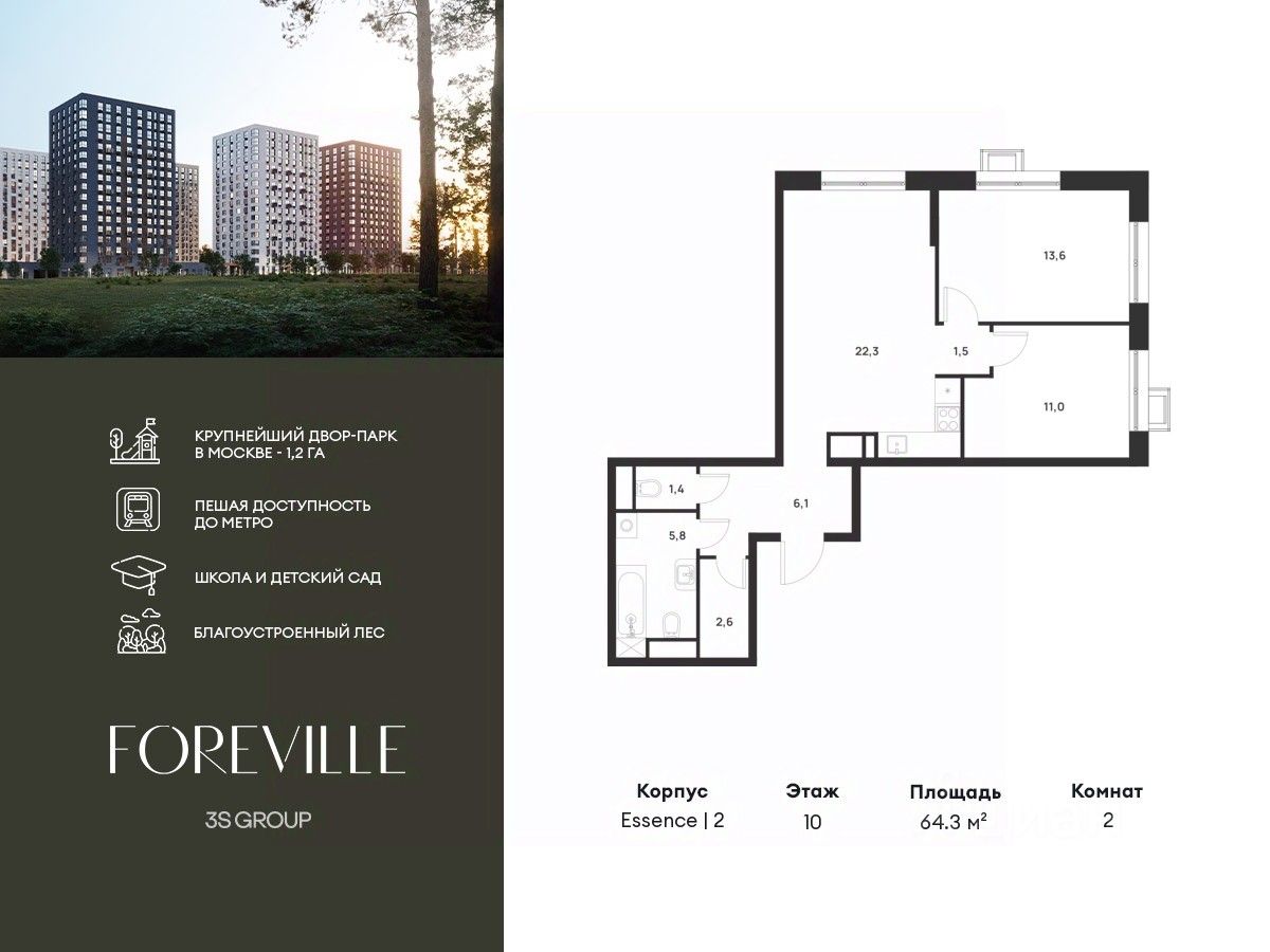Предчистовая отделка в подарок! Пешая доступность от метро и московская прописка! Продается уютная 2-комн. квартира площадью 64,3 кв.м на 10 этаже 17 этажного жилого комплекса бизнес-класса Foreville от 3S Group.
