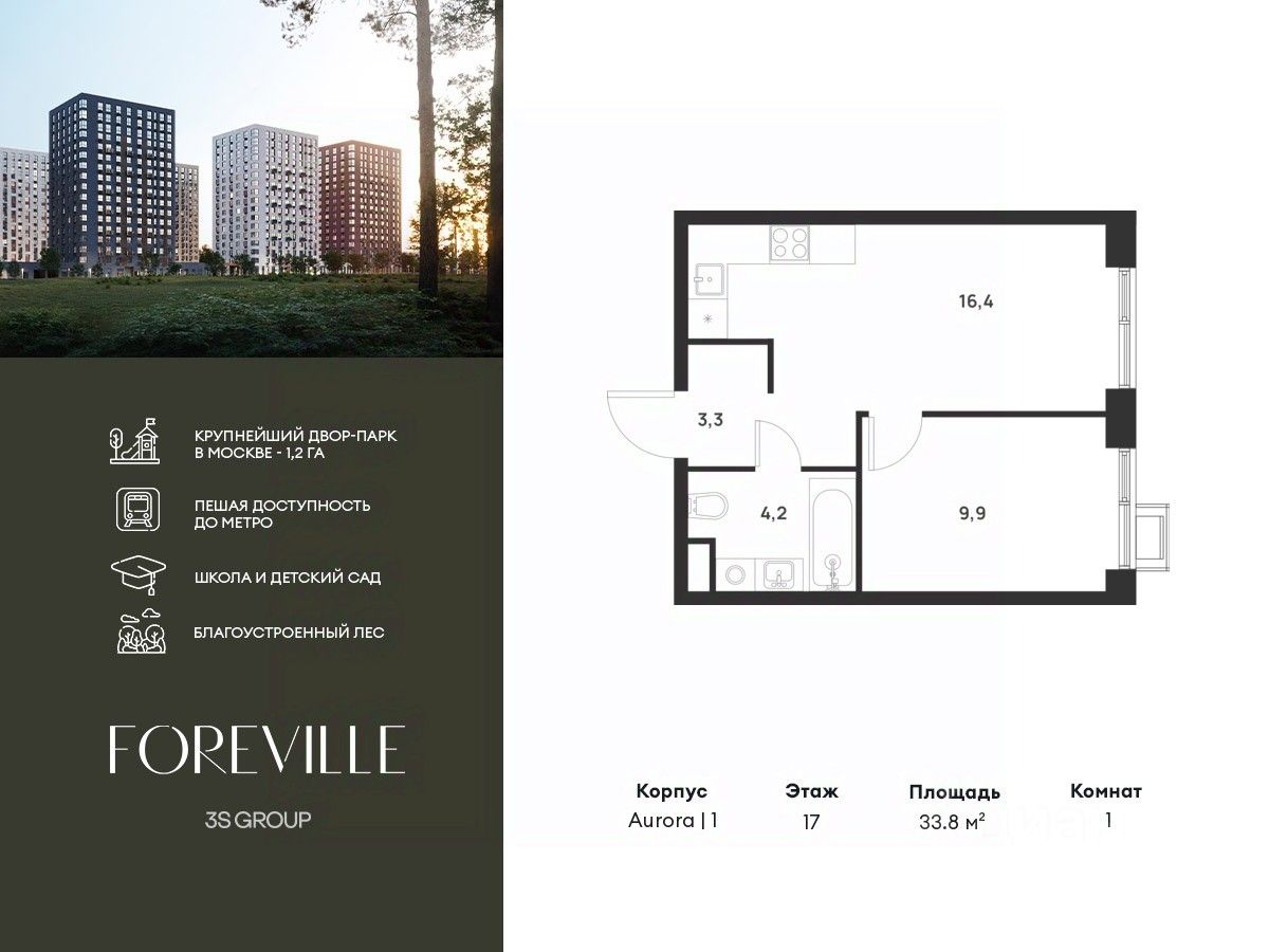 Продается уютная 1-комн. квартира площадью 33,8 кв.м на 17 этаже 17 этажного жилого комплекса бизнес-класса Foreville от 3S Group.