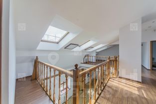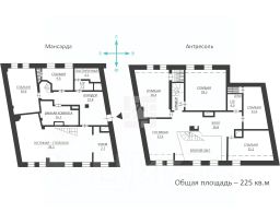 Квартира 225 кв.м. На первом уровне: кухня, гостиная с действующим камином, столовая с высокими потолками (второй свет), основная спальня+гардеробная+ванная комната, гостевой санузел, постирочная. На втором уровне - мансардные окна пуленепробиваемые с обогревом. Большой холл-гостиная, 3 спальни, кабинет, 3 санузла. Кондиционеры. Теплые полы. В квартире 2 телефонные линии. Фиксированное машиноместо на наземной парковке в охраняемом внутреннем дворе.